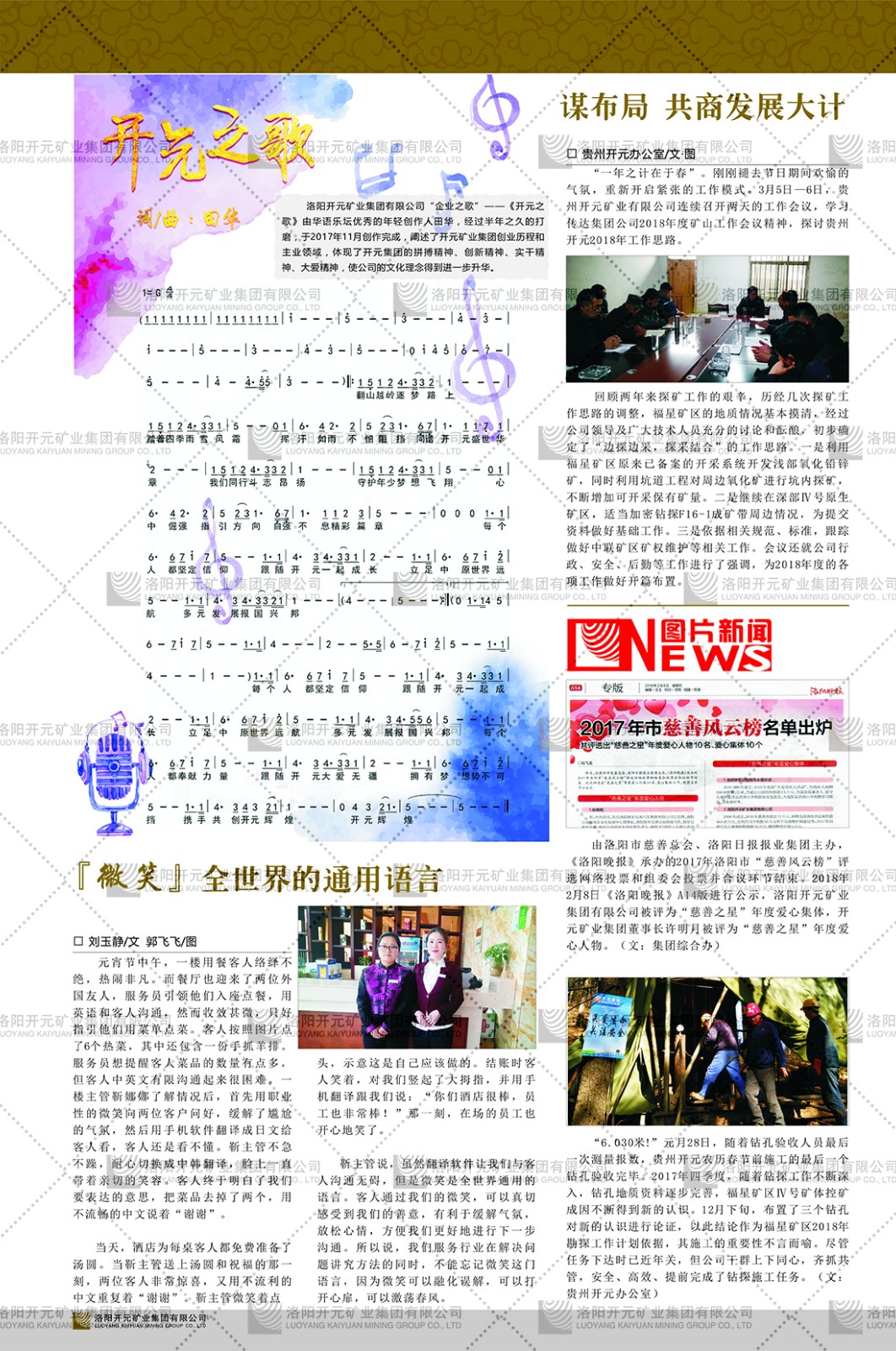 洛陽開元礦業(yè)集團(tuán)有限公司簡介洛陽開元礦業(yè)集團(tuán)有限公司,始成立于2006年,位于洛陽市開元大道269號(hào)。集團(tuán)旗下共有五余家全資子公司,業(yè)務(wù)涉及有色金屬礦山開發(fā)、礦產(chǎn)品購銷與進(jìn)出口貿(mào)易、房地產(chǎn)開發(fā)、文化藝術(shù)、企業(yè)管理與咨詢、資本投資等多個(gè)領(lǐng)域。民建河南省委委員、民建河南省委企業(yè)委副主任、民建洛陽市委委員、企業(yè)委主任、洛陽民建企業(yè)家協(xié)會(huì)會(huì)長許明月是公司創(chuàng)始人,現(xiàn)任洛陽開元礦業(yè)集團(tuán)有限公司董事長。在礦業(yè)領(lǐng)域,洛陽開元礦業(yè)集團(tuán)擁有多家實(shí)力雄厚的子公司:貴州開元礦業(yè)有限公司探、采礦權(quán)面積共11.33平方公里;興??h銅鑫礦業(yè)有限公司探礦權(quán)面積8.76平方公里,礦山資源潛力巨大;2021年,開元集團(tuán)與盧氏中科礦業(yè)有限公司開展戰(zhàn)略合作。盧氏中科礦業(yè)有限公司專注于有色金屬的浮選、加工和銷售,擁有強(qiáng)大的技術(shù)支撐平臺(tái),是集探、采、選、冶、研為一體的中大型綜合礦業(yè)企業(yè)。目前,盧氏中科王家河1000噸選礦廠已成功投產(chǎn),雙河金礦、柳關(guān)欒盧鉛鋅礦相繼順利開工,樓房銀礦與圪老灣鉛鋅礦的深部探礦重大突破,標(biāo)志著礦山版圖取得重大進(jìn)展,為開元集團(tuán)后續(xù)發(fā)展奠定了堅(jiān)實(shí)基礎(chǔ)。在文化傳媒領(lǐng)域,洛陽市明月美術(shù)館通過豐富多樣的藝術(shù)展覽、學(xué)術(shù)研討和公共教育活動(dòng),努力打造一個(gè)集展覽、交流、教育、研究為一體的綜合性藝術(shù)平臺(tái)。此外,在金融投資領(lǐng)域,開元集團(tuán)旗下的北京明峰資本管理有限公司專注于投資具有高增長潛力的優(yōu)秀企業(yè),特別是高科技、新能源、環(huán)保等新興產(chǎn)業(yè),為客戶提供個(gè)性化的資產(chǎn)配置服務(wù)。在做好企業(yè)經(jīng)營的同時(shí),開元集團(tuán)始終不忘企業(yè)的社會(huì)責(zé)任和家國情懷,以突出的愛心公益事跡,開展了一系列公益慈善活動(dòng):“民建林”公益事業(yè)通過“思源基金”“幫幫公益”線上公益平臺(tái),與眾多愛心人士籌措資金20余萬元;資助541名貧困大學(xué)生共計(jì)270余萬元,推進(jìn)“數(shù)字助力——河南AI人才培養(yǎng)”;捐款10萬元,馳援京津冀、黑龍江洪水地質(zhì)災(zāi)害……公司于2017年底被洛陽市慈善總會(huì)評(píng)為“洛陽慈善風(fēng)云榜——十大愛心集體”。洛陽開元礦業(yè)集團(tuán)有限公司秉承持續(xù)發(fā)展理念,憑借多年來良好的企業(yè)信譽(yù)與經(jīng)營業(yè)績,與全國多家企業(yè)建立了良好合作關(guān)系,受到社會(huì)各界的一致好評(píng),多次榮獲“納稅標(biāo)兵”“先進(jìn)企業(yè)”“招商引資模范企業(yè)”等榮譽(yù)稱號(hào)?;赝麃頃r(shí)路,開元人勠力同心,以“闖”的精神和“創(chuàng)”的勁頭,一路披荊斬棘,踏過千山萬水;展望新未來,開元人凝心聚力,不執(zhí)于“舊”,無畏于“新”,秉承“勇于跨越,追求卓越”的企業(yè)精神,乘著國家高質(zhì)量發(fā)展新征程的東風(fēng),跨過高山,越過大海,向著集團(tuán)多元化、國際化的目標(biāo),逐夢(mèng)遠(yuǎn)航,跨越前行!