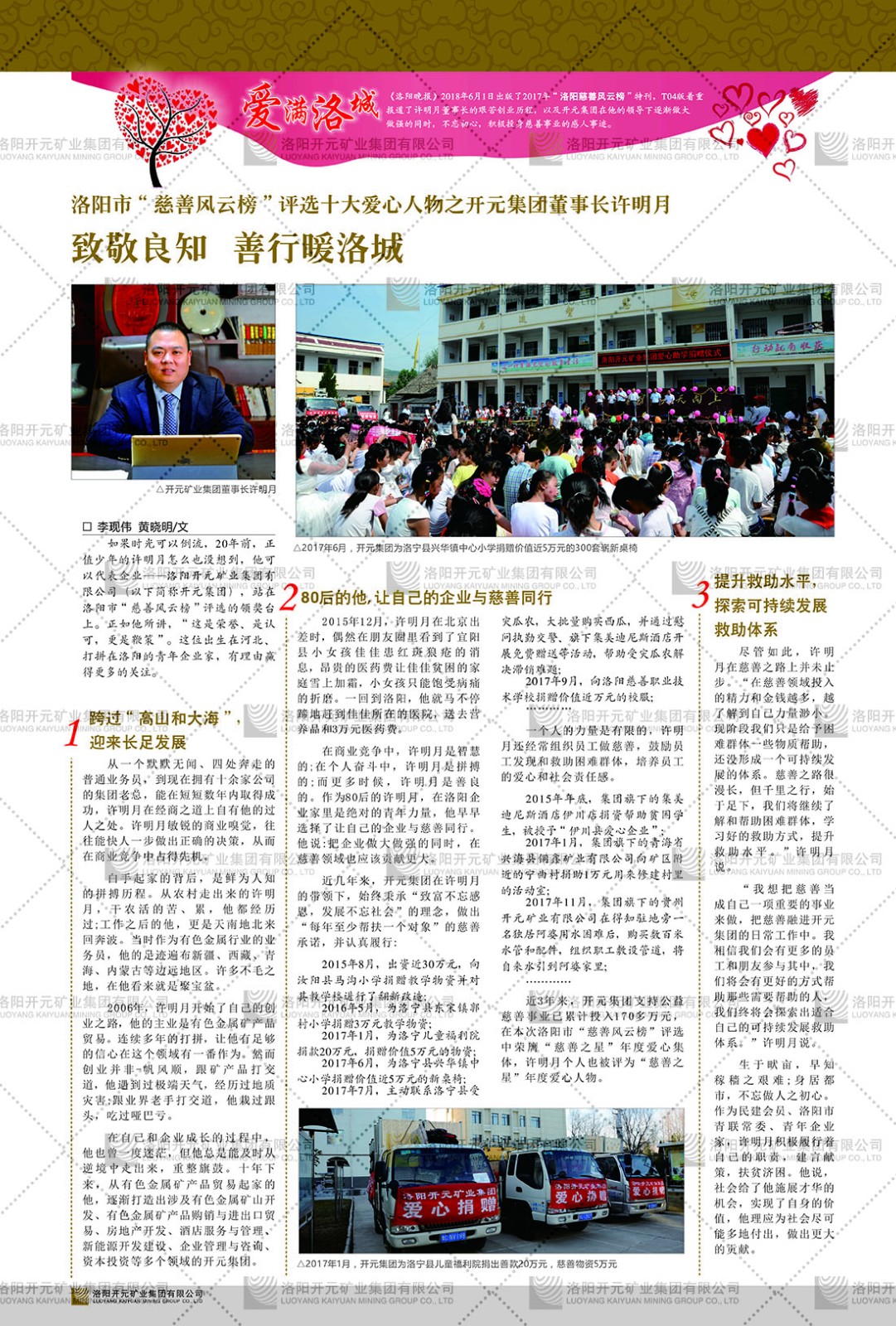 洛陽(yáng)開(kāi)元礦業(yè)集團(tuán)有限公司簡(jiǎn)介洛陽(yáng)開(kāi)元礦業(yè)集團(tuán)有限公司,始成立于2006年,位于洛陽(yáng)市開(kāi)元大道269號(hào)。集團(tuán)旗下共有五余家全資子公司,業(yè)務(wù)涉及有色金屬礦山開(kāi)發(fā)、礦產(chǎn)品購(gòu)銷(xiāo)與進(jìn)出口貿(mào)易、房地產(chǎn)開(kāi)發(fā)、文化藝術(shù)、企業(yè)管理與咨詢、資本投資等多個(gè)領(lǐng)域。民建河南省委委員、民建河南省委企業(yè)委副主任、民建洛陽(yáng)市委委員、企業(yè)委主任、洛陽(yáng)民建企業(yè)家協(xié)會(huì)會(huì)長(zhǎng)許明月是公司創(chuàng)始人,現(xiàn)任洛陽(yáng)開(kāi)元礦業(yè)集團(tuán)有限公司董事長(zhǎng)。在礦業(yè)領(lǐng)域,洛陽(yáng)開(kāi)元礦業(yè)集團(tuán)擁有多家實(shí)力雄厚的子公司:貴州開(kāi)元礦業(yè)有限公司探、采礦權(quán)面積共11.33平方公里;興海縣銅鑫礦業(yè)有限公司探礦權(quán)面積8.76平方公里,礦山資源潛力巨大;2021年,開(kāi)元集團(tuán)與盧氏中科礦業(yè)有限公司開(kāi)展戰(zhàn)略合作。盧氏中科礦業(yè)有限公司專(zhuān)注于有色金屬的浮選、加工和銷(xiāo)售,擁有強(qiáng)大的技術(shù)支撐平臺(tái),是集探、采、選、冶、研為一體的中大型綜合礦業(yè)企業(yè)。目前,盧氏中科王家河1000噸選礦廠已成功投產(chǎn),雙河金礦、柳關(guān)欒盧鉛鋅礦相繼順利開(kāi)工,樓房銀礦與圪老灣鉛鋅礦的深部探礦重大突破,標(biāo)志著礦山版圖取得重大進(jìn)展,為開(kāi)元集團(tuán)后續(xù)發(fā)展奠定了堅(jiān)實(shí)基礎(chǔ)。在文化傳媒領(lǐng)域,洛陽(yáng)市明月美術(shù)館通過(guò)豐富多樣的藝術(shù)展覽、學(xué)術(shù)研討和公共教育活動(dòng),努力打造一個(gè)集展覽、交流、教育、研究為一體的綜合性藝術(shù)平臺(tái)。此外,在金融投資領(lǐng)域,開(kāi)元集團(tuán)旗下的北京明峰資本管理有限公司專(zhuān)注于投資具有高增長(zhǎng)潛力的優(yōu)秀企業(yè),特別是高科技、新能源、環(huán)保等新興產(chǎn)業(yè),為客戶提供個(gè)性化的資產(chǎn)配置服務(wù)。在做好企業(yè)經(jīng)營(yíng)的同時(shí),開(kāi)元集團(tuán)始終不忘企業(yè)的社會(huì)責(zé)任和家國(guó)情懷,以突出的愛(ài)心公益事跡,開(kāi)展了一系列公益慈善活動(dòng):“民建林”公益事業(yè)通過(guò)“思源基金”“幫幫公益”線上公益平臺(tái),與眾多愛(ài)心人士籌措資金20余萬(wàn)元;資助541名貧困大學(xué)生共計(jì)270余萬(wàn)元,推進(jìn)“數(shù)字助力——河南AI人才培養(yǎng)”;捐款10萬(wàn)元,馳援京津冀、黑龍江洪水地質(zhì)災(zāi)害……公司于2017年底被洛陽(yáng)市慈善總會(huì)評(píng)為“洛陽(yáng)慈善風(fēng)云榜——十大愛(ài)心集體”。洛陽(yáng)開(kāi)元礦業(yè)集團(tuán)有限公司秉承持續(xù)發(fā)展理念,憑借多年來(lái)良好的企業(yè)信譽(yù)與經(jīng)營(yíng)業(yè)績(jī),與全國(guó)多家企業(yè)建立了良好合作關(guān)系,受到社會(huì)各界的一致好評(píng),多次榮獲“納稅標(biāo)兵”“先進(jìn)企業(yè)”“招商引資模范企業(yè)”等榮譽(yù)稱號(hào)?;赝麃?lái)時(shí)路,開(kāi)元人勠力同心,以“闖”的精神和“創(chuàng)”的勁頭,一路披荊斬棘,踏過(guò)千山萬(wàn)水;展望新未來(lái),開(kāi)元人凝心聚力,不執(zhí)于“舊”,無(wú)畏于“新”,秉承“勇于跨越,追求卓越”的企業(yè)精神,乘著國(guó)家高質(zhì)量發(fā)展新征程的東風(fēng),跨過(guò)高山,越過(guò)大海,向著集團(tuán)多元化、國(guó)際化的目標(biāo),逐夢(mèng)遠(yuǎn)航,跨越前行!