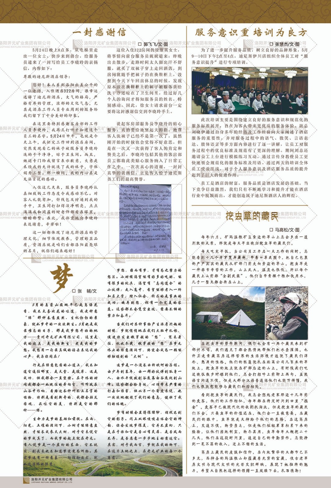 洛陽開元礦業(yè)集團(tuán)有限公司簡介洛陽開元礦業(yè)集團(tuán)有限公司,始成立于2006年,位于洛陽市開元大道269號。集團(tuán)旗下共有五余家全資子公司,業(yè)務(wù)涉及有色金屬礦山開發(fā)、礦產(chǎn)品購銷與進(jìn)出口貿(mào)易、房地產(chǎn)開發(fā)、文化藝術(shù)、企業(yè)管理與咨詢、資本投資等多個(gè)領(lǐng)域。民建河南省委委員、民建河南省委企業(yè)委副主任、民建洛陽市委委員、企業(yè)委主任、洛陽民建企業(yè)家協(xié)會(huì)會(huì)長許明月是公司創(chuàng)始人,現(xiàn)任洛陽開元礦業(yè)集團(tuán)有限公司董事長。在礦業(yè)領(lǐng)域,洛陽開元礦業(yè)集團(tuán)擁有多家實(shí)力雄厚的子公司:貴州開元礦業(yè)有限公司探、采礦權(quán)面積共11.33平方公里;興??h銅鑫礦業(yè)有限公司探礦權(quán)面積8.76平方公里,礦山資源潛力巨大;2021年,開元集團(tuán)與盧氏中科礦業(yè)有限公司開展戰(zhàn)略合作。盧氏中科礦業(yè)有限公司專注于有色金屬的浮選、加工和銷售,擁有強(qiáng)大的技術(shù)支撐平臺,是集探、采、選、冶、研為一體的中大型綜合礦業(yè)企業(yè)。目前,盧氏中科王家河1000噸選礦廠已成功投產(chǎn),雙河金礦、柳關(guān)欒盧鉛鋅礦相繼順利開工,樓房銀礦與圪老灣鉛鋅礦的深部探礦重大突破,標(biāo)志著礦山版圖取得重大進(jìn)展,為開元集團(tuán)后續(xù)發(fā)展奠定了堅(jiān)實(shí)基礎(chǔ)。在文化傳媒領(lǐng)域,洛陽市明月美術(shù)館通過豐富多樣的藝術(shù)展覽、學(xué)術(shù)研討和公共教育活動(dòng),努力打造一個(gè)集展覽、交流、教育、研究為一體的綜合性藝術(shù)平臺。此外,在金融投資領(lǐng)域,開元集團(tuán)旗下的北京明峰資本管理有限公司專注于投資具有高增長潛力的優(yōu)秀企業(yè),特別是高科技、新能源、環(huán)保等新興產(chǎn)業(yè),為客戶提供個(gè)性化的資產(chǎn)配置服務(wù)。在做好企業(yè)經(jīng)營的同時(shí),開元集團(tuán)始終不忘企業(yè)的社會(huì)責(zé)任和家國情懷,以突出的愛心公益事跡,開展了一系列公益慈善活動(dòng):“民建林”公益事業(yè)通過“思源基金”“幫幫公益”線上公益平臺,與眾多愛心人士籌措資金20余萬元;資助541名貧困大學(xué)生共計(jì)270余萬元,推進(jìn)“數(shù)字助力——河南AI人才培養(yǎng)”;捐款10萬元,馳援京津冀、黑龍江洪水地質(zhì)災(zāi)害……公司于2017年底被洛陽市慈善總會(huì)評為“洛陽慈善風(fēng)云榜——十大愛心集體”。洛陽開元礦業(yè)集團(tuán)有限公司秉承持續(xù)發(fā)展理念,憑借多年來良好的企業(yè)信譽(yù)與經(jīng)營業(yè)績,與全國多家企業(yè)建立了良好合作關(guān)系,受到社會(huì)各界的一致好評,多次榮獲“納稅標(biāo)兵”“先進(jìn)企業(yè)”“招商引資模范企業(yè)”等榮譽(yù)稱號?;赝麃頃r(shí)路,開元人勠力同心,以“闖”的精神和“創(chuàng)”的勁頭,一路披荊斬棘,踏過千山萬水;展望新未來,開元人凝心聚力,不執(zhí)于“舊”,無畏于“新”,秉承“勇于跨越,追求卓越”的企業(yè)精神,乘著國家高質(zhì)量發(fā)展新征程的東風(fēng),跨過高山,越過大海,向著集團(tuán)多元化、國際化的目標(biāo),逐夢遠(yuǎn)航,跨越前行!